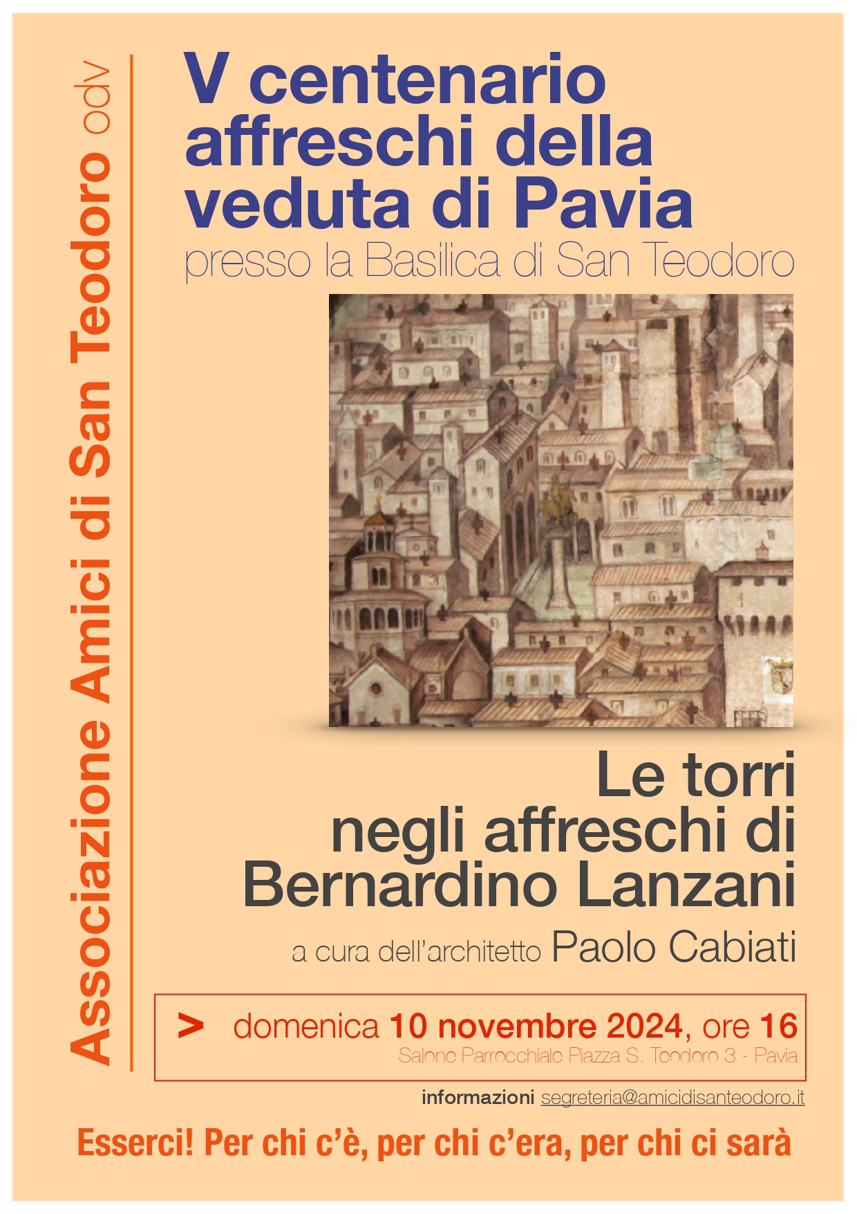 Domenica 10 novembre 2024 alle ore 16, presso il Salone Parrocchiale della Basilica di San Teodoro a Pavia, l’Associazione Amici di San Teodoro odv presenta l’incontro dal titolo “Le torri negli affreschi di Bernardino Lanzani”, con relatore l’architetto Paolo Cabiati che guiderà i partecipanti alla scoperta delle iconiche rappresentazioni della città nelle opere del pittore pavese Bernardino Lanzani, presenti nella basilica di San Teodoro.