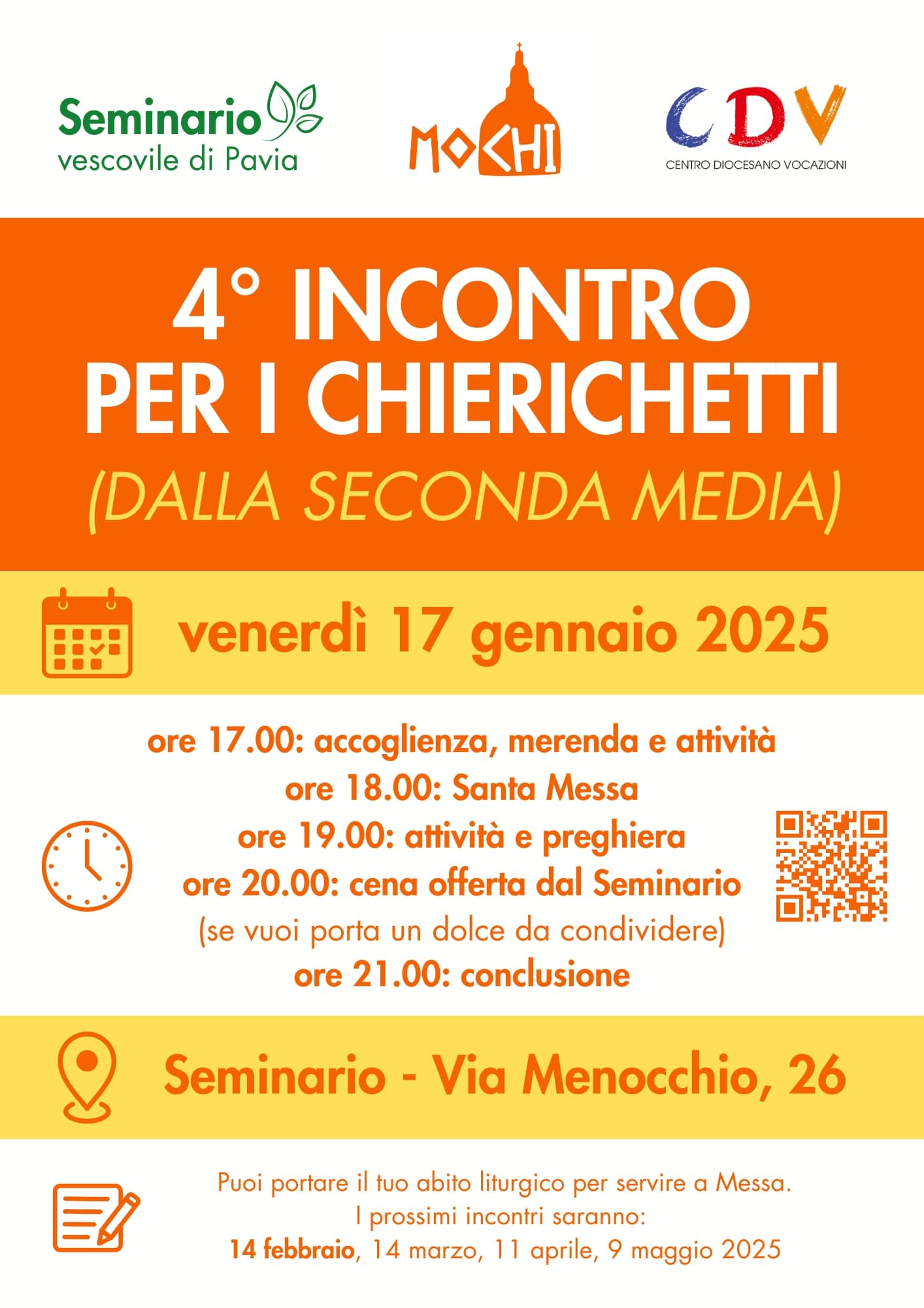 Il Seminario Vescovile di Pavia ospiterà il 4° incontro del percorso riservato ai chierichetti, dedicato a ragazzi e ragazze a partire dalla seconda media. L’appuntamento è fissato per venerdì 17 gennaio presso la sede di via Menocchio, 26.