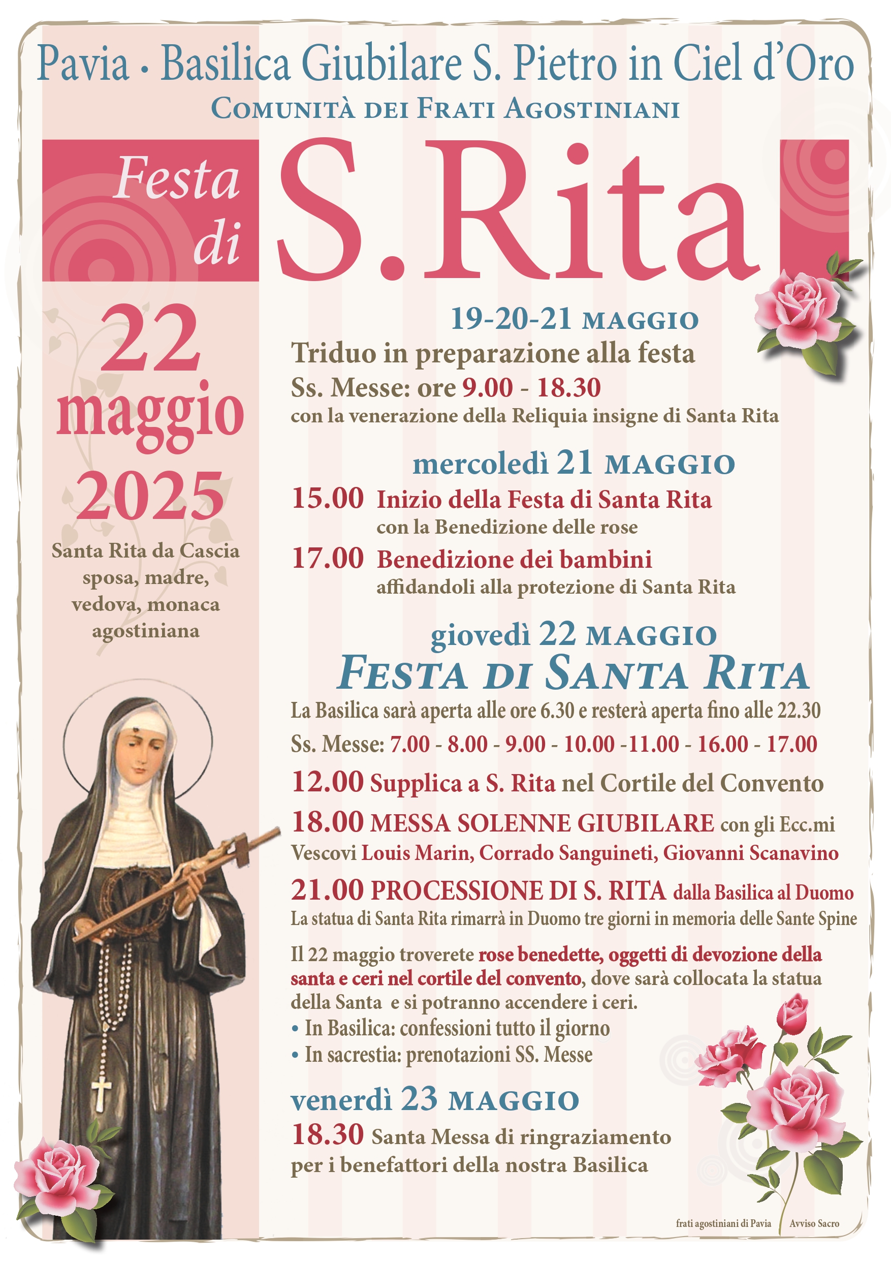 Anche quest’anno la Comunità dei Frati Agostiniani di Pavia invita i fedeli a partecipare con devozione alla tradizionale festa di Santa Rita da Cascia, che culminerà giovedì 22 maggio 2025 nella Basilica Giubilare di San Pietro in Ciel d’Oro. Un appuntamento molto sentito dalla città, dedicato alla “santa degli impossibili”, sposa, madre, vedova e monaca agostiniana.