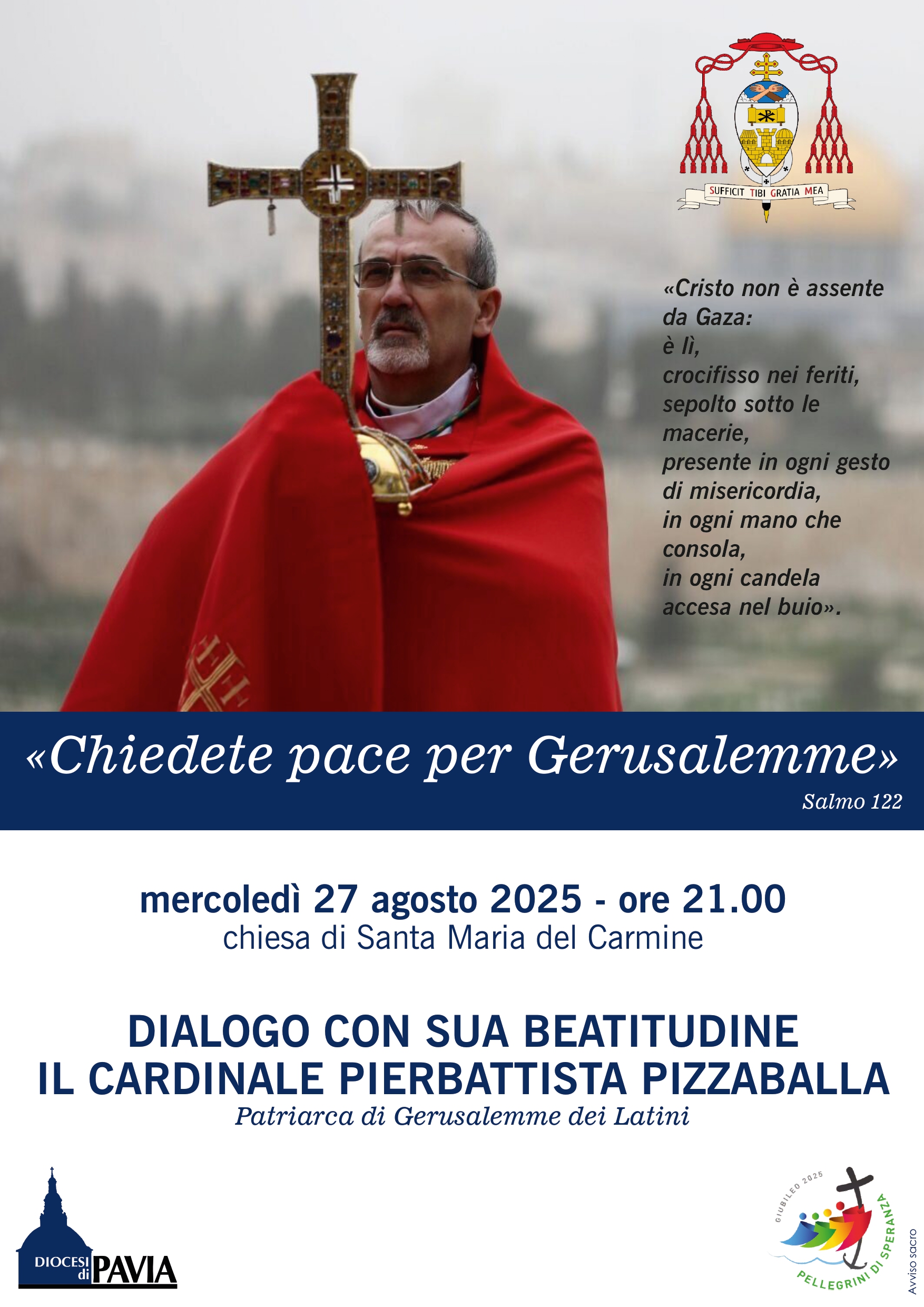 il Cardinale Pizzaballa, patriarca di Gerusalemme dei Latini, sarà presente la sera di mercoledì 27 agosto p.v. alle 21.00 nella chiesa di Santa Maria del Carmine in Pavia.