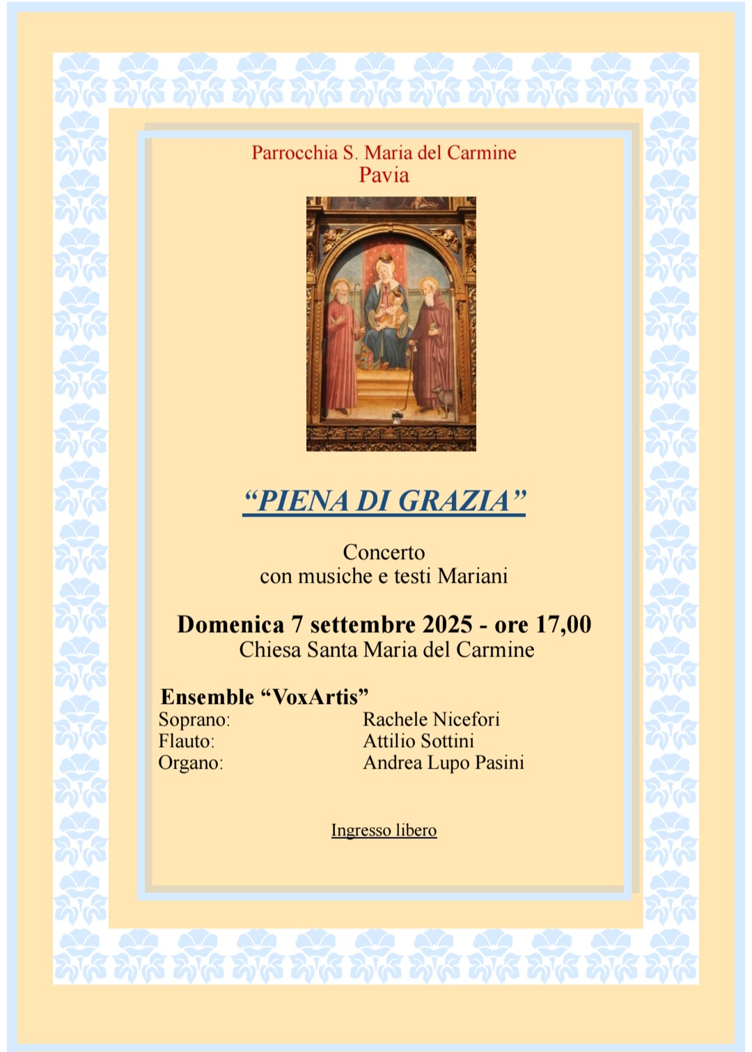La Parrocchia di Santa Maria del Carmine di Pavia propone un appuntamento speciale di musica e spiritualità. Domenica 7 settembre 2025, alle ore 17, nella splendida cornice della Chiesa del Carmine, si terrà il concerto “Piena di Grazia”, con musiche e testi mariani.