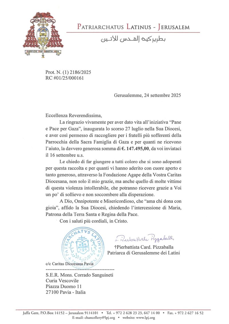 Un grazie che viene dalla Terra Santa e raggiunge la comunità di Pavia. Con una lettera inviata al vescovo Corrado Sanguineti, il Patriarca latino di Gerusalemme, card. Pierbattista Pizzaballa, ha espresso riconoscenza per l’iniziativa “Pane e Pace per Gaza”, promossa lo scorso luglio nella diocesi pavese. La raccolta, sostenuta attraverso la Fondazione Agape della Caritas, ha permesso di destinare 147.495 euro alla parrocchia della Sacra Famiglia di Gaza, dove la popolazione vive in condizioni drammatiche a causa della guerra.