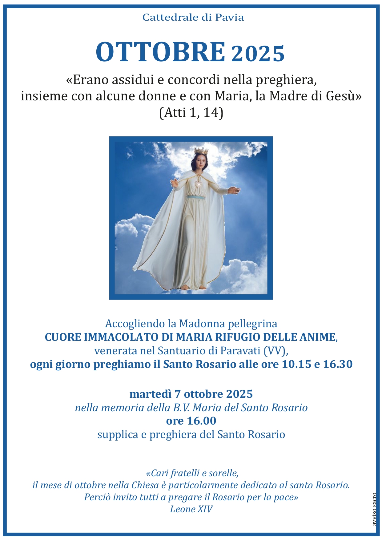 Nel mese di ottobre, dedicato al Rosario, la Cattedrale di Pavia ha accolto la Madonna pellegrina, “Cuore Immacolato di Maria Rifugio delle Anime”, venerata a Paravati (VV). Ogni giorno, alle 10.15 e alle 16.30, si recita insieme il Rosario.