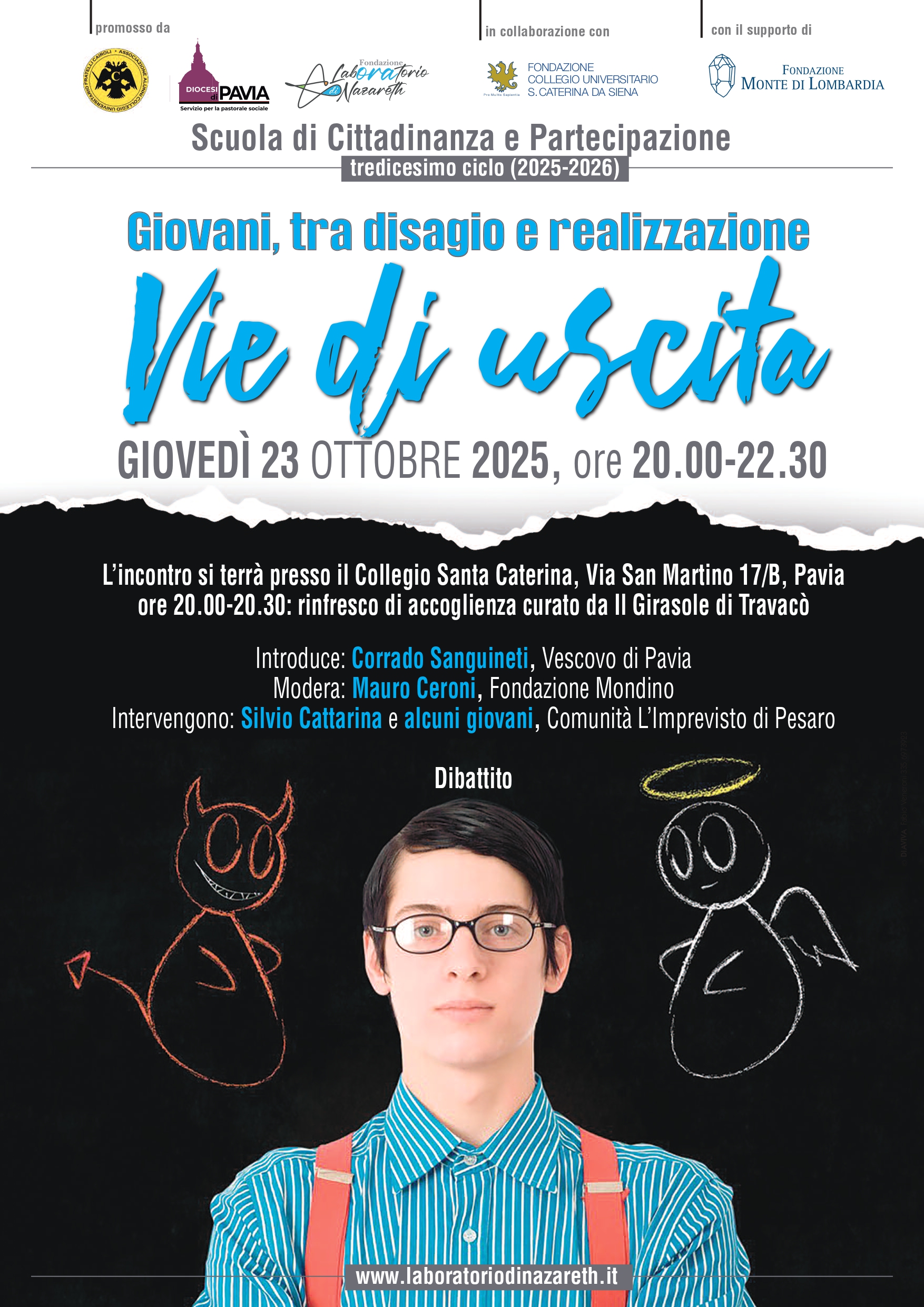 Il primo appuntamento dell’anno, dal titolo “Giovani, tra disagio e realizzazione. Vie di uscita”, si terrà giovedì 23 ottobre 2025, dalle 20 alle 22.30, presso il Collegio Santa Caterina (via San Martino 17/B, Pavia).