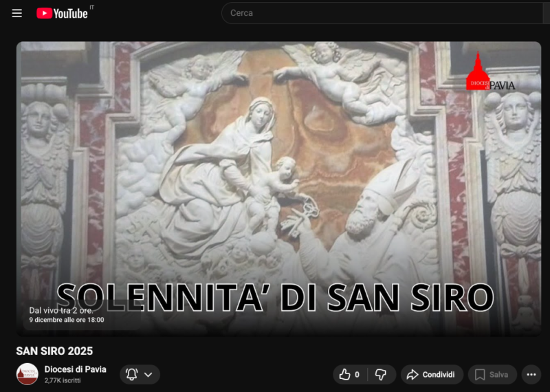 Il Solenne Pontificale delle ore 18 di martedì 9 dicembre, in occasione di San Siro, festa Patronale, che si svolgerà in Cattedrale a Pavia, verrà trasmesso in diretta sul canale YouTube della Diocesi di Pavia al seguente link: