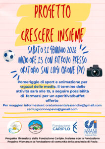 Un pomeriggio di sport, gioco e condivisione per continuare a costruire legami e comunità. Si terrà sabato 31 gennaio 2026, con inizio alle ore 15 (ritrovo presso l’oratorio San Luigi Orione, in via San Luigi Orione a Pavia), l’appuntamento del progetto “Crescere Insieme”, rivolto ai ragazzi delle scuole medie.