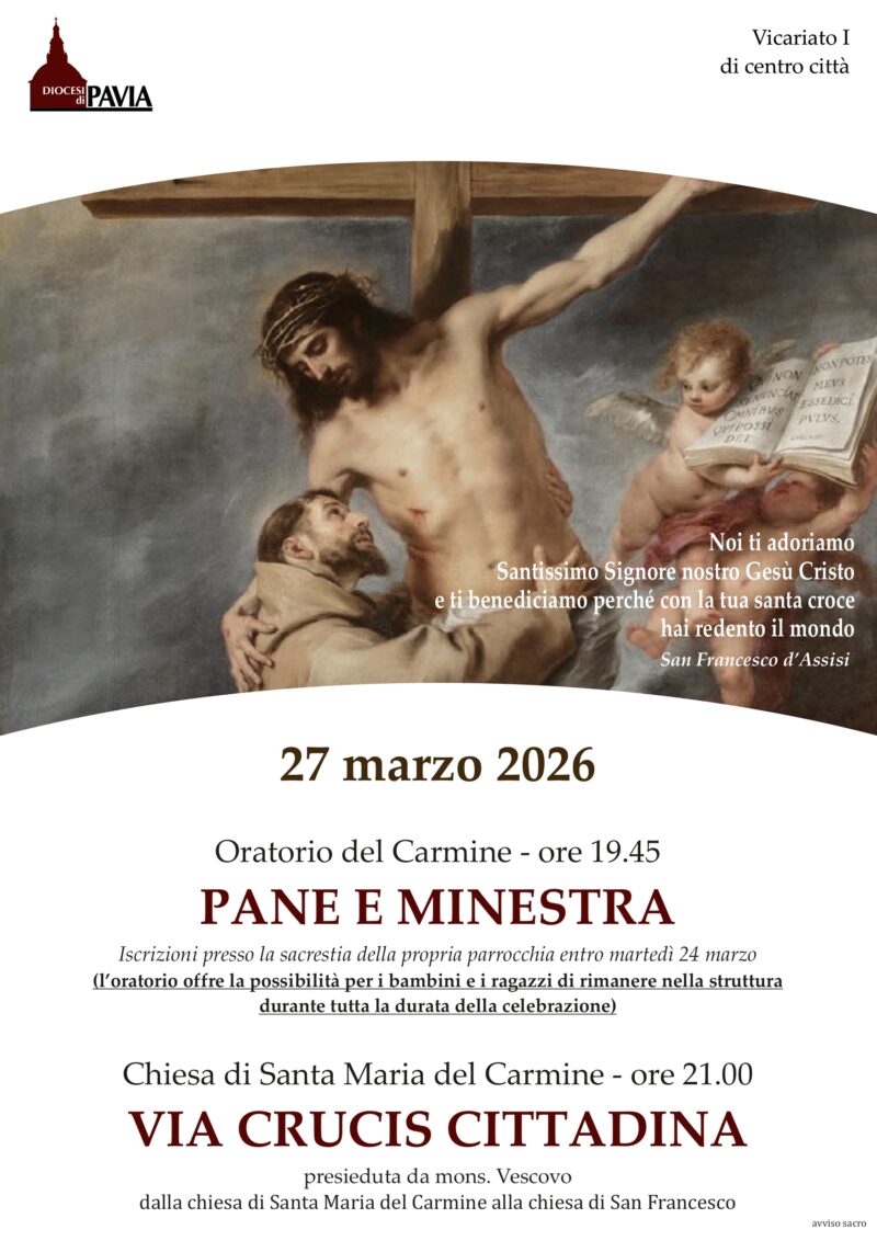 Venerdì 27 marzo il Vicariato I di centro città della Diocesi di Pavia propone un significativo momento di condivisione e preghiera aperto a tutti i fedeli.